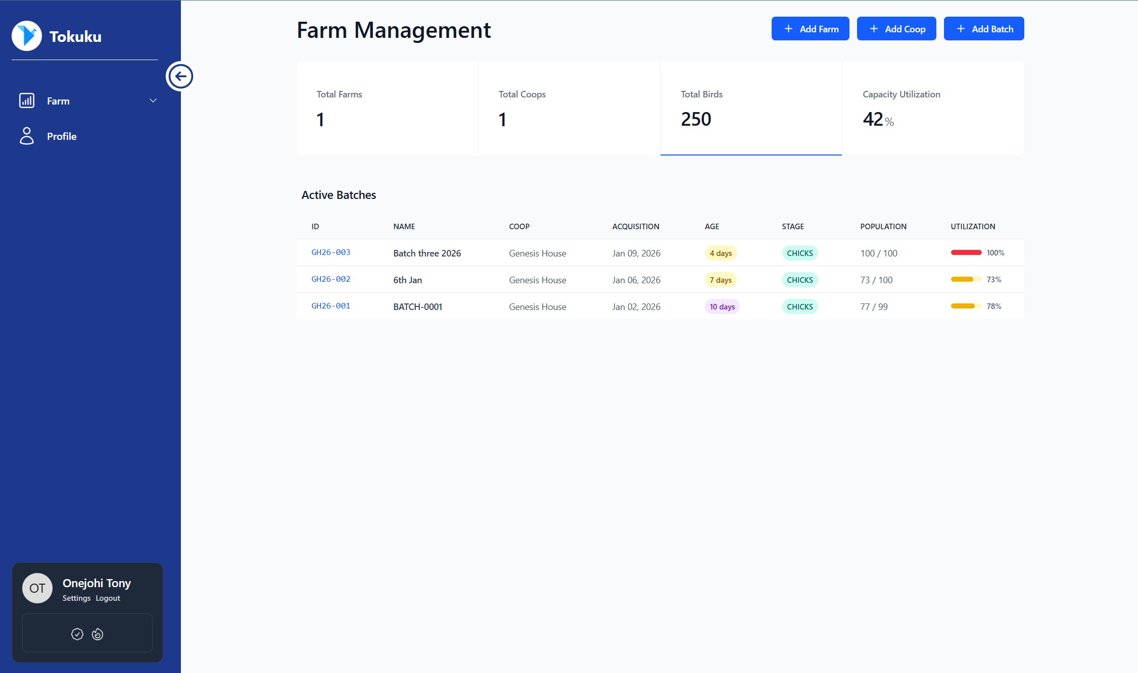 Tokuku brings every part of your poultry operation into one powerful platform. From managing farms, coops, and flocks to tracking daily performance and resources, Tokuku helps farmers stay organized and data-informed. Designed for simplicity and insight, it turns everyday farm records into actionable information — helping you grow healthier flocks, reduce waste, and boost profitability with confidence.